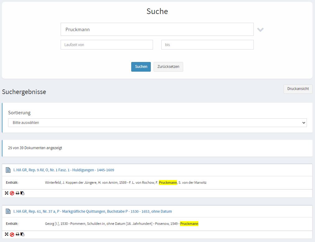 Findet die Suche Treffer, die Ihren Eingaben entsprechen, werden sie als Liste ausgeworfen. Die Liste können Sie über ein Drop-Down-Menü alphabetisch, chronologisch oder nach Signaturen sortieren. Die Gesamtzahl der Treffer wird Ihnen ebenfalls angezeigt. Suchworte werden mit einer gelben Markierung unterlegt.